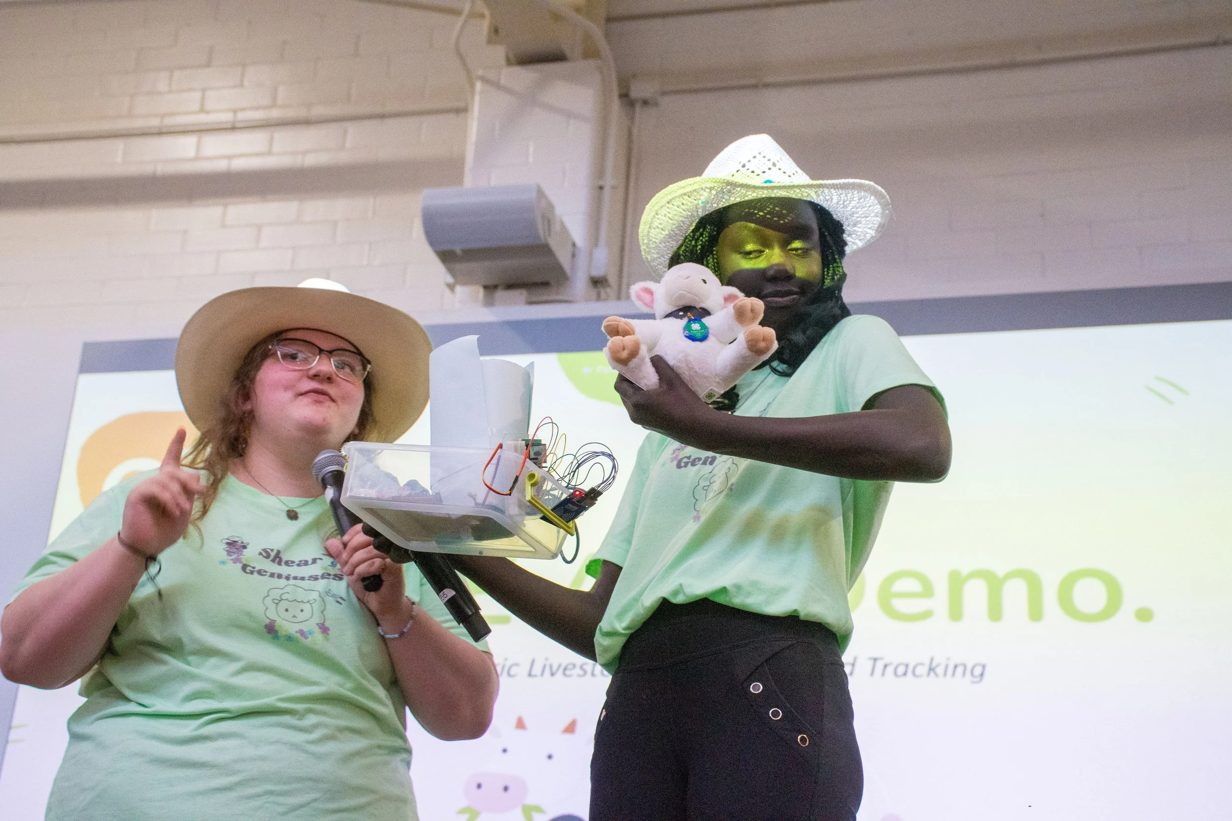 The Sheer Geniuses! A Team from Utah that focused their invention on community design in their journey to inventing the B.L.E.A.T. (Biometric Livestock Evaluation and Tracking). The B.L.E.A.T. is an individualized livestock feeding and tracking system targeted towards farmers with livestock.